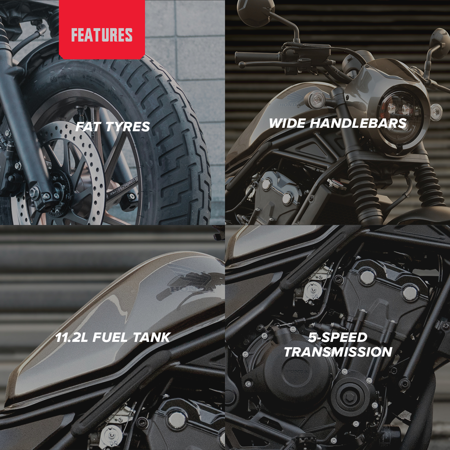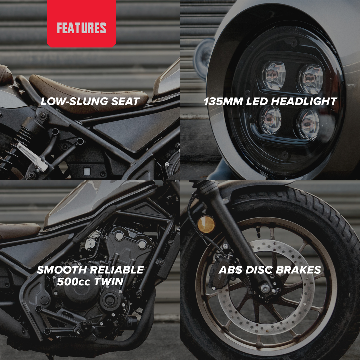 In addition to the same features of the standard model, the Rebel 500S also features a headlight cowl and all-black fork covers and gaiters to give it a sleek look that oozes with style.